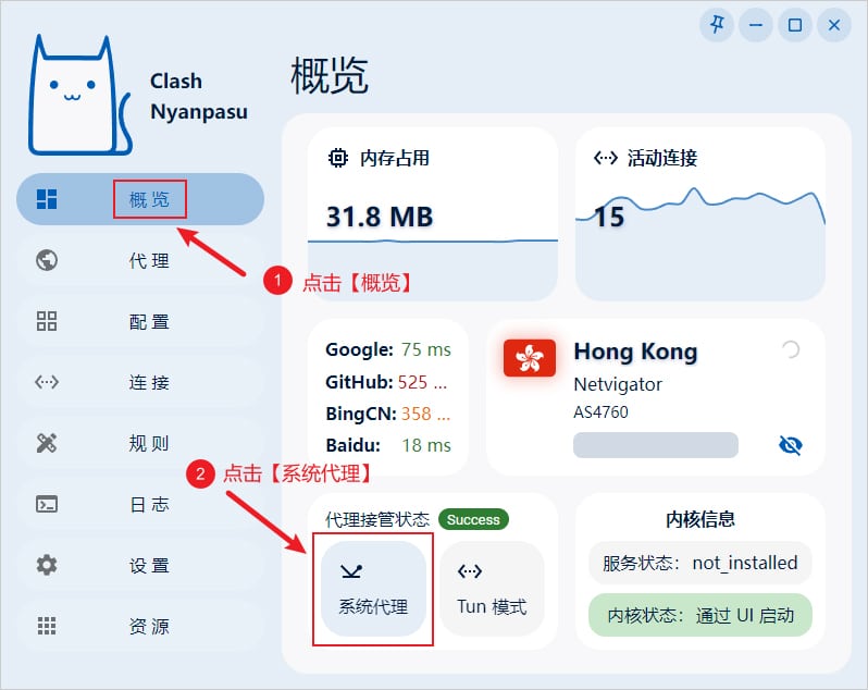 启用系统代理,需要点击界面左侧菜单 概览 选项卡,找到 代理接管状态 并单击 系统代理 即可,开启状态下代理接管状态字样旁边会出现 Success 字样,如下图所示。