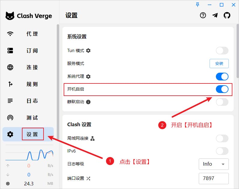 设置开机自启动,需要点击界面左侧菜单设置选项卡,找到开机自启并开启开关即可,开启状态下按钮状态为蓝色,如下图所示为开启状态。